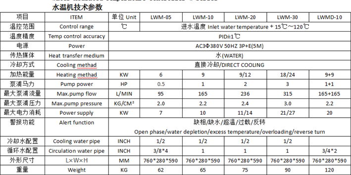 水溫機(jī)廠家的水溫機(jī)智能型微電腦P.I.D自動(dòng)演算控制器,具有加熱和冷卻雙P.I.D自動(dòng)演算控制.臺(tái)灣元欣高溫泵,流量大,傳遞熱量速度快,運(yùn)轉(zhuǎn)順暢;接觸器,過(guò)熱保護(hù)器均選用施耐德系列產(chǎn)品;瑞典進(jìn)口發(fā)熱管內(nèi)絲.監(jiān)控溫度設(shè)定上下限溫差.控溫更精確;自動(dòng)顯示運(yùn)轉(zhuǎn)狀態(tài),中文面板操作方便;開(kāi)機(jī)自動(dòng)排氣,開(kāi)機(jī)自動(dòng)降溫及延時(shí)關(guān)機(jī),確保溫控安全;特殊管路設(shè)計(jì)加溫快.